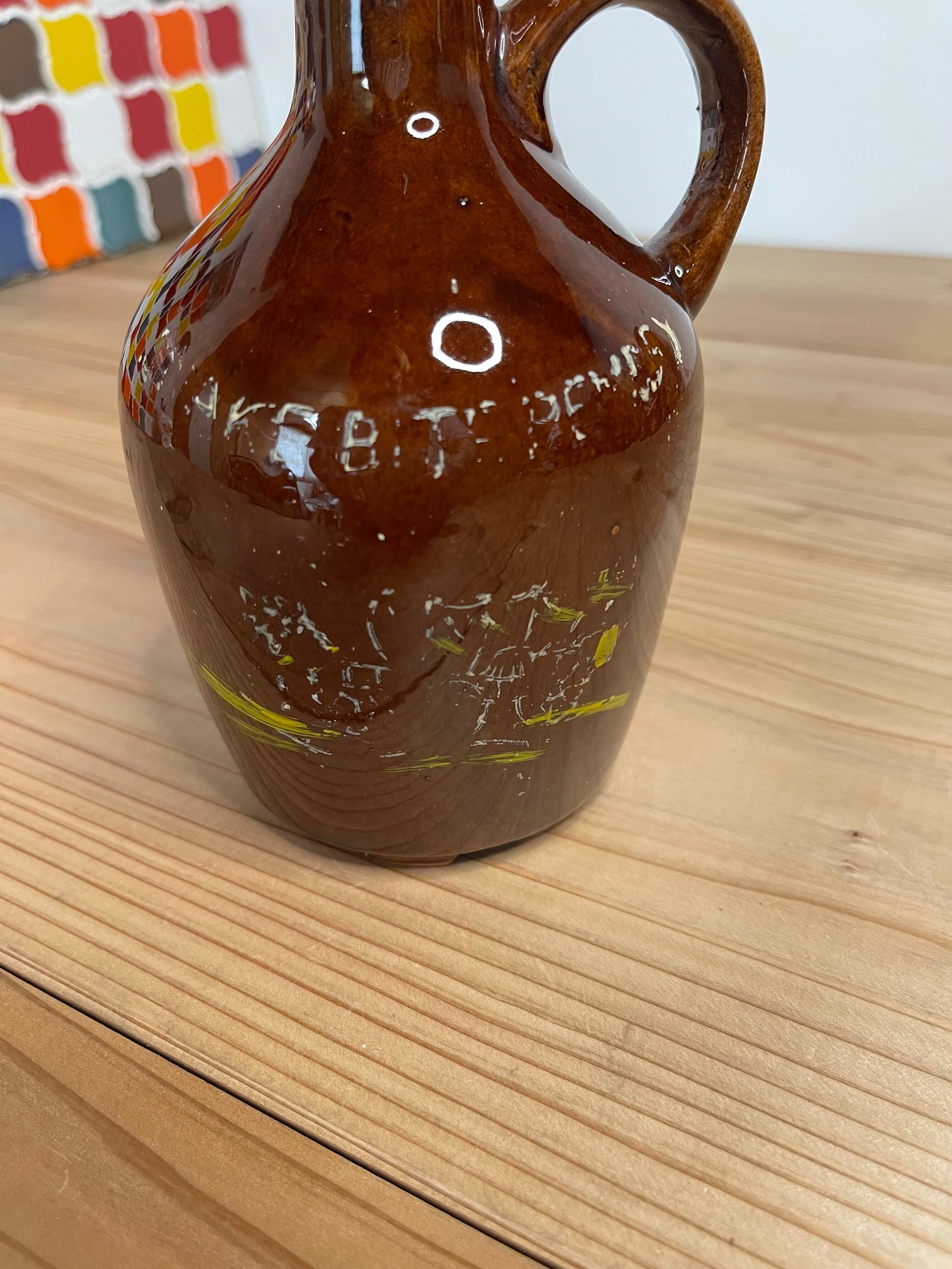 全体はブラウンの陶器ボディで、ハンドル付きのクラシックなフォルム。表面には経年のカスれにより恐らくですが「SNAKE BITE REMEDY」の文字と模様が入っていると思われますがこれもヴィンテージ特有の味わいとしてお楽しみください。
