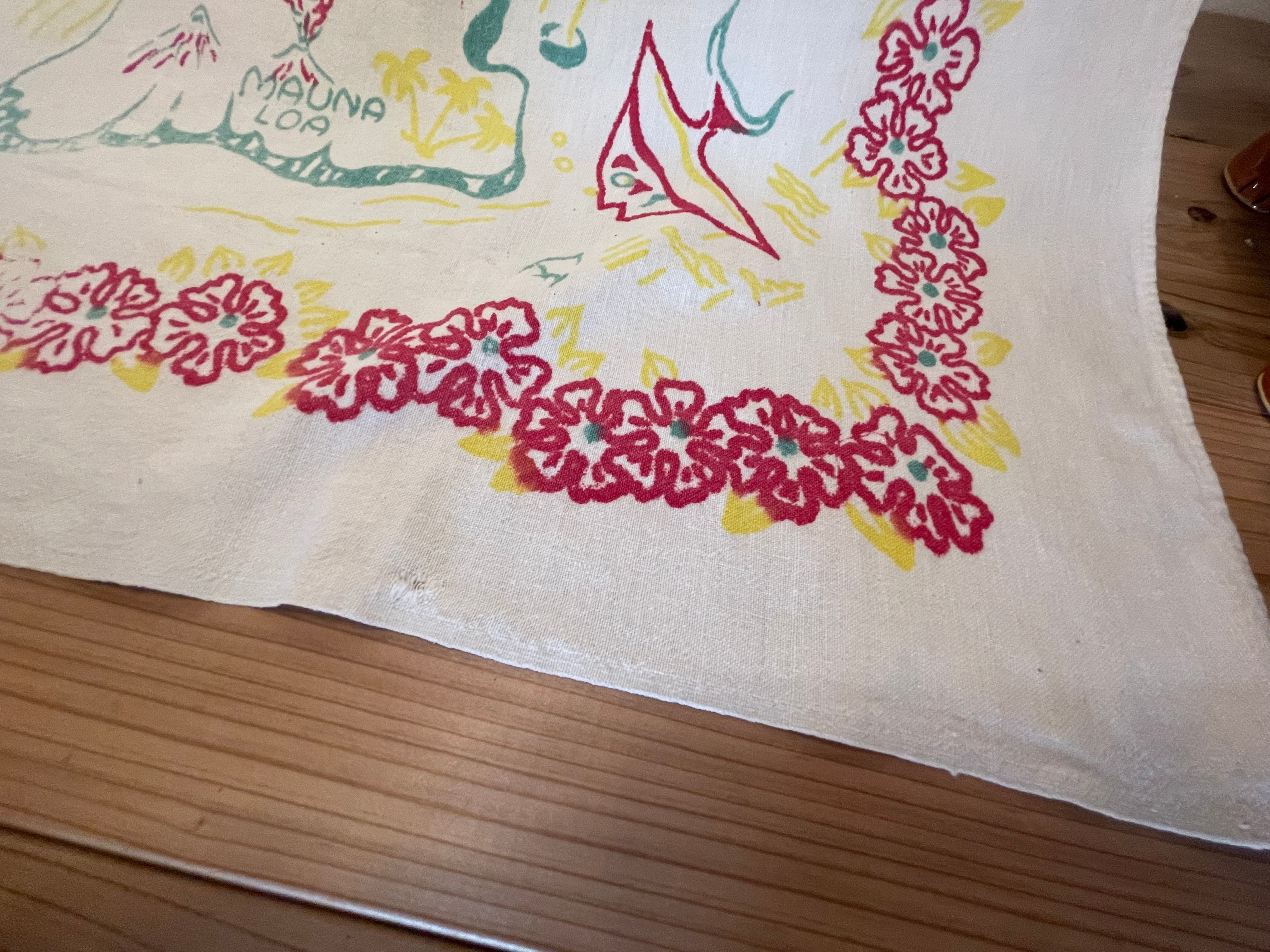 とても珍しくて可愛いデザインを見つけました!1950年代ハワイアンマップテーブルクロスになります。経年による印刷の擦れ等御座います。