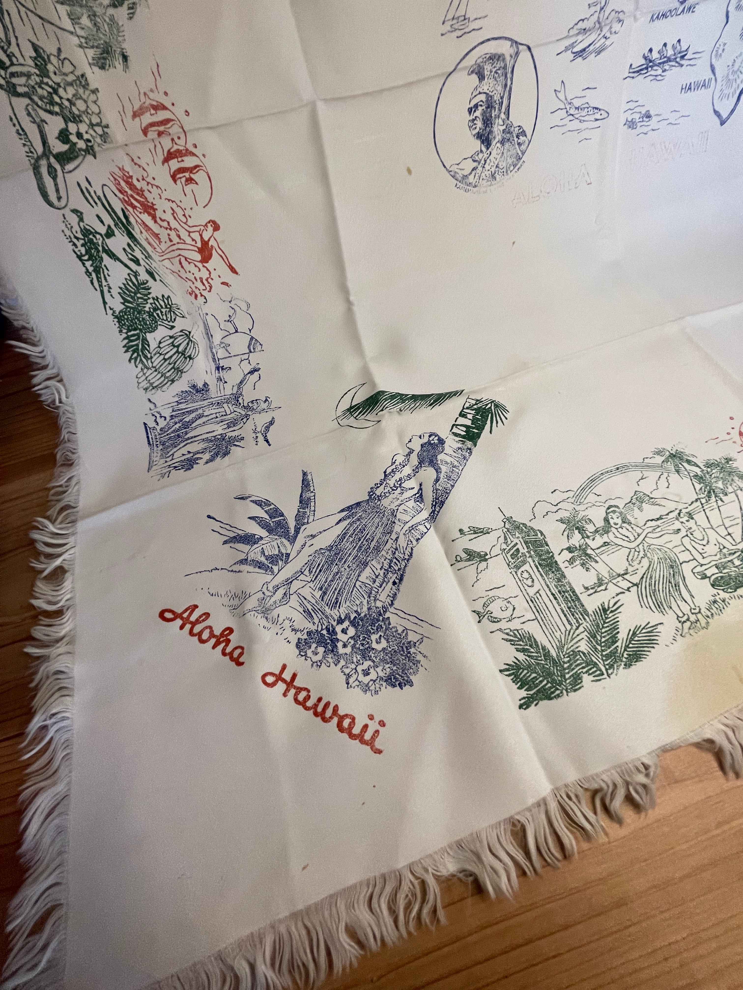 前回直ぐに売れてしまいましたが、またデザイン違い年代も大戦中の1940年代ハンドプリントのハワイアンマップテーブルクロスが再入荷しました。経年による印刷の擦れ、シミ等御座います